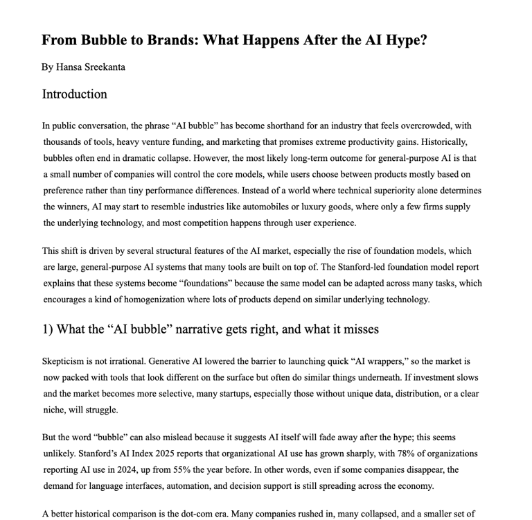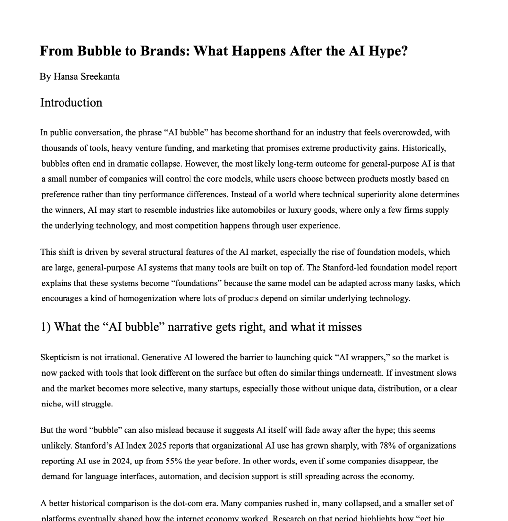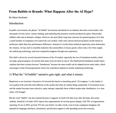 This article explores the currently burgeoning debate topic of whether AI is a bubble that will soon explode, through approaching and viewing the circumstance both economically and sociologically, referencing the likely and sustainable AI market/economy as that of the automotive or luxury industries. It also considers the limitations and unprecedented potentials of the AI economy due to its nature of personalization as well as customary platform/app style adaptation, making a strong prediction and future advice in cultivating the long-sighted trajectory.